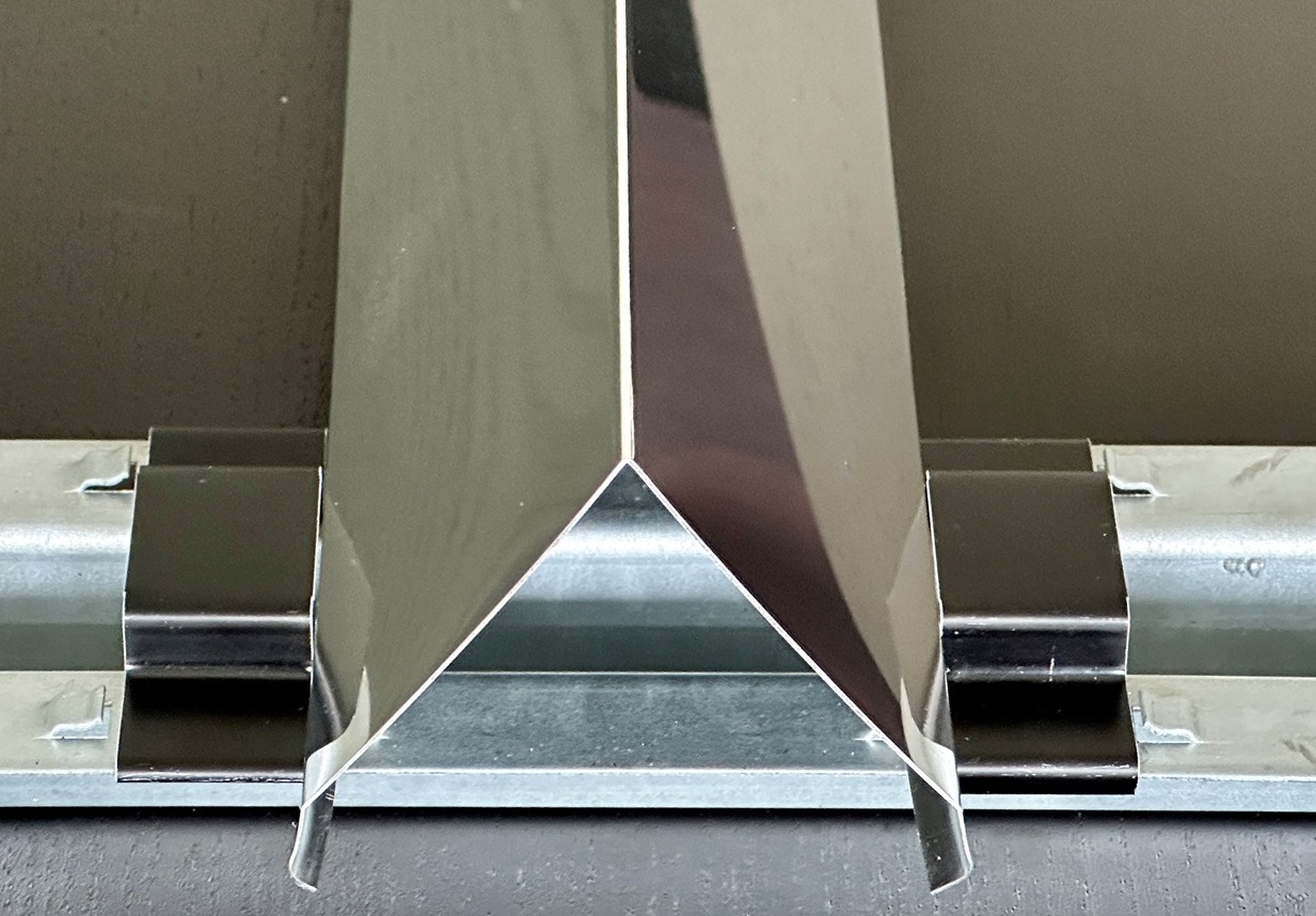 Im Unterschied zu den Standard MW-Baffles erfolgt die Befestigung auf der ORIGINAL DOBNER Universal-Tragschiene. Das Paneel wird nur eingeklemmt, ohne zu schrauben oder zu nieten. Ein Sicherungsclip ist nicht erforderlich. Die Paneelsicherung erfolgt durch einfaches Umbiegen der in der Tragschiene integrierten Sicherungs-Arretierung.
